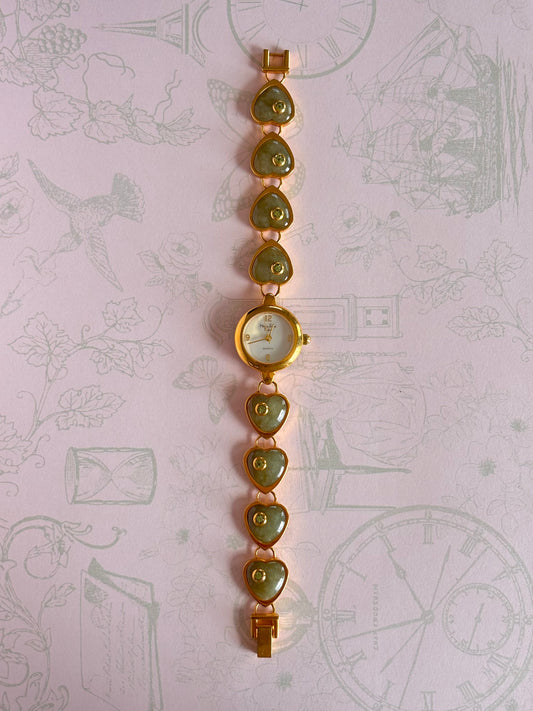 Vintage Gold Toned Heart With Heart Shape Jade Links